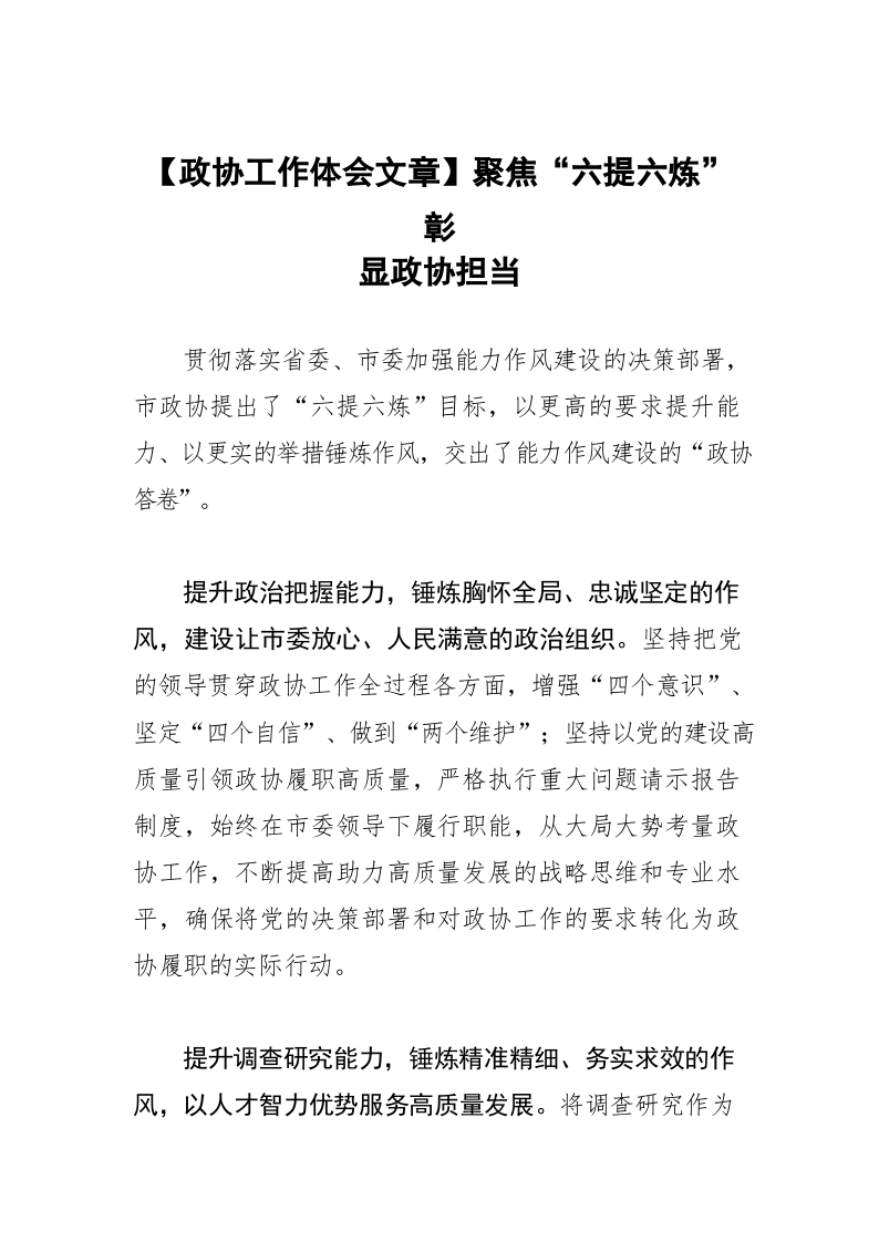 / 【政协工作体会文章】聚焦“六提六炼” 彰显政协担当