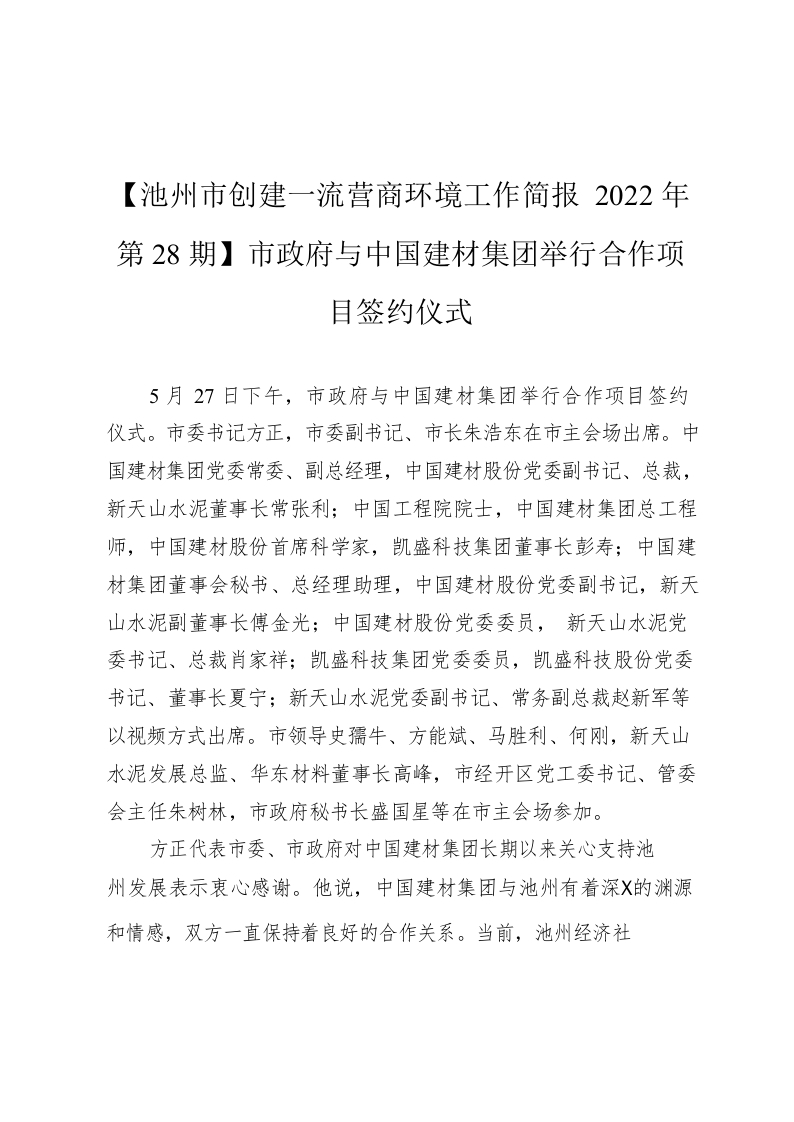 / 【池州市创建一流营商环境工作简报2022年第28期】市政府与中国建材集团举行合作项目签约仪式