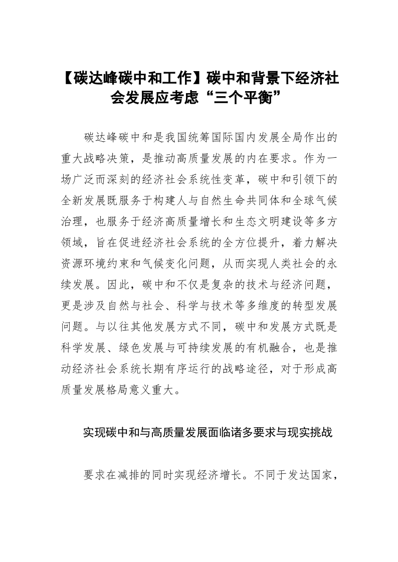 / 【碳达峰碳中和工作】碳中和背景下经济社会发展应考虑“三个平衡”
