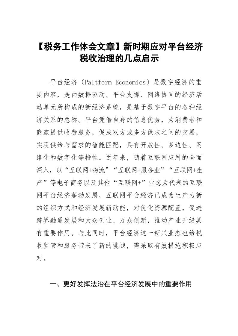 / 【税务工作体会文章】新时期应对平台经济税收治理的几点启示