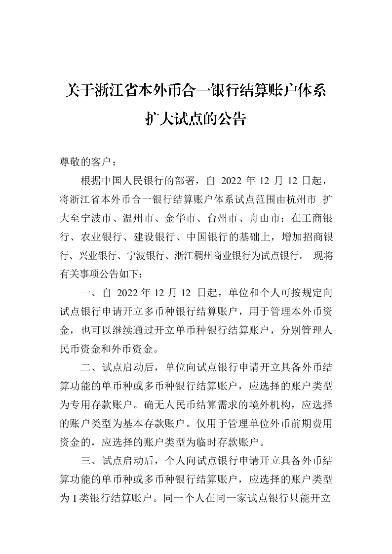 关于浙江省本外币合一银行结算账户体系扩大试点的公告