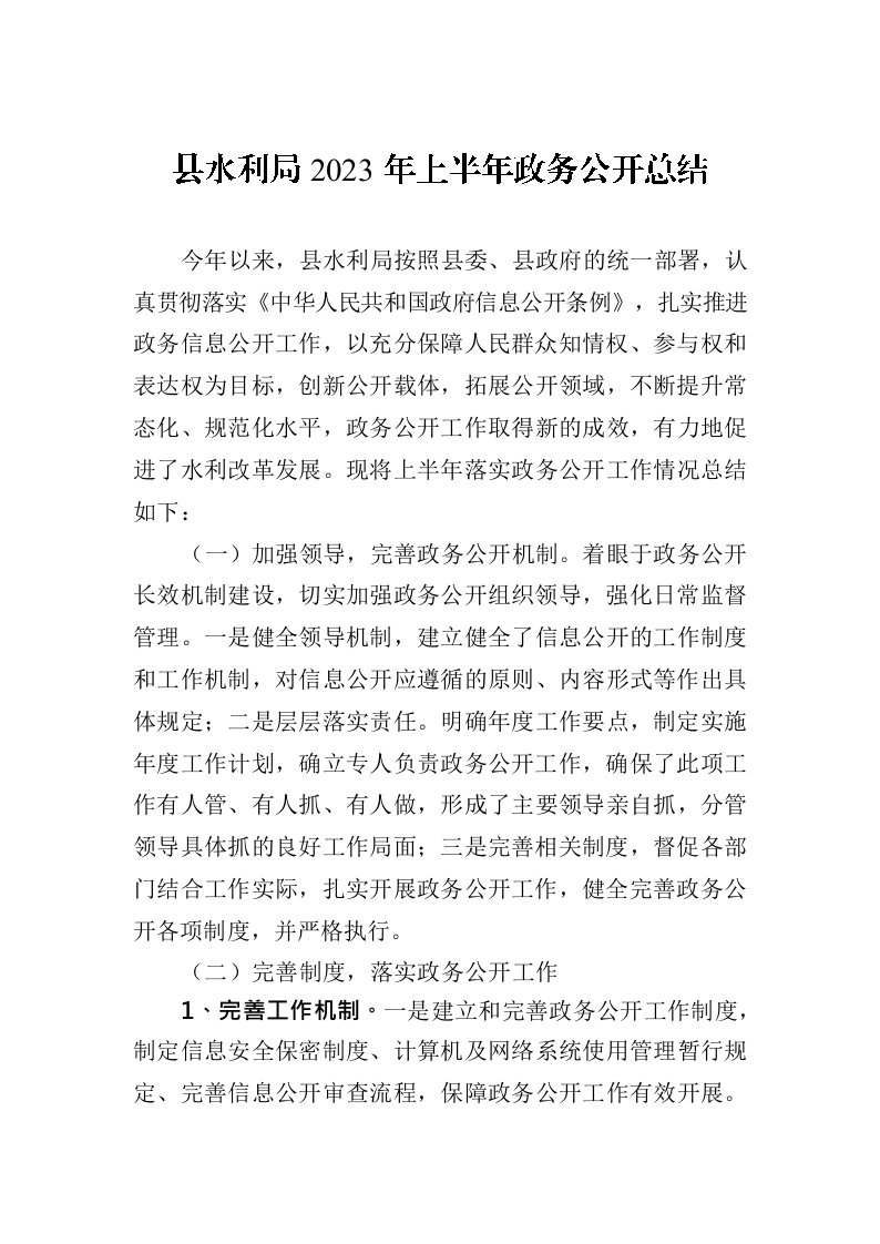 / 县水利局2023年上半年政务公开总结(20230629)