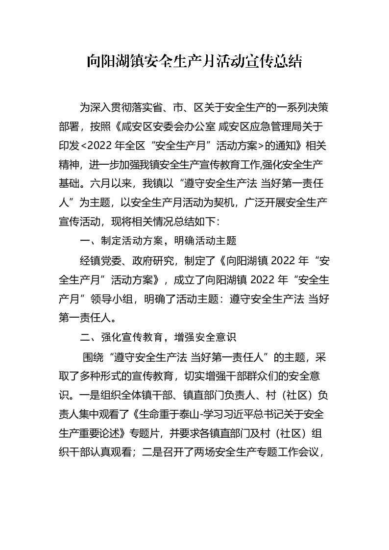 向阳湖镇安全生产月活动宣传总结