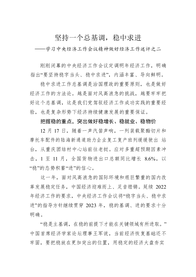 / 学习中央经济工作会议精神做好经济工作述评之二:坚持一个总基调,稳中求进(20221224)