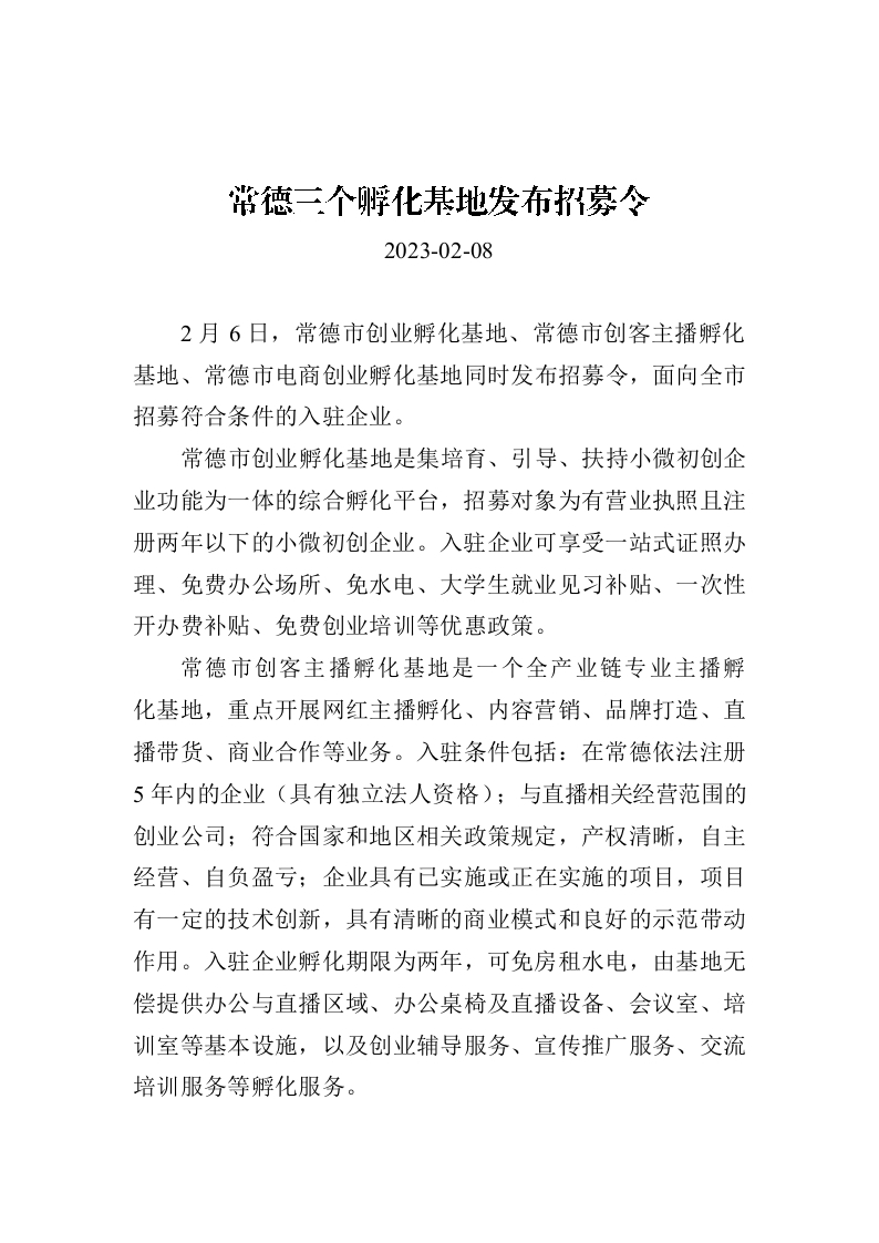 常德三个孵化基地发布招募令