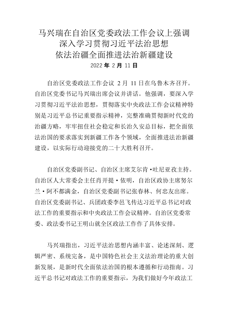 / 马兴瑞在自治区党委政法工作会议上强调深入学习贯彻习近平法治思想依法治疆全面推进法治新疆建设