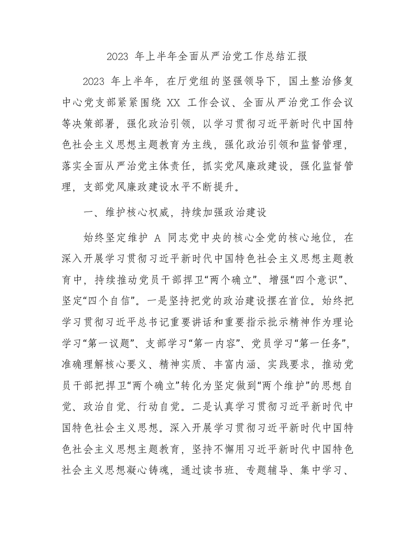 2023年上半年党支部全面从严治党工作总结汇报3000字