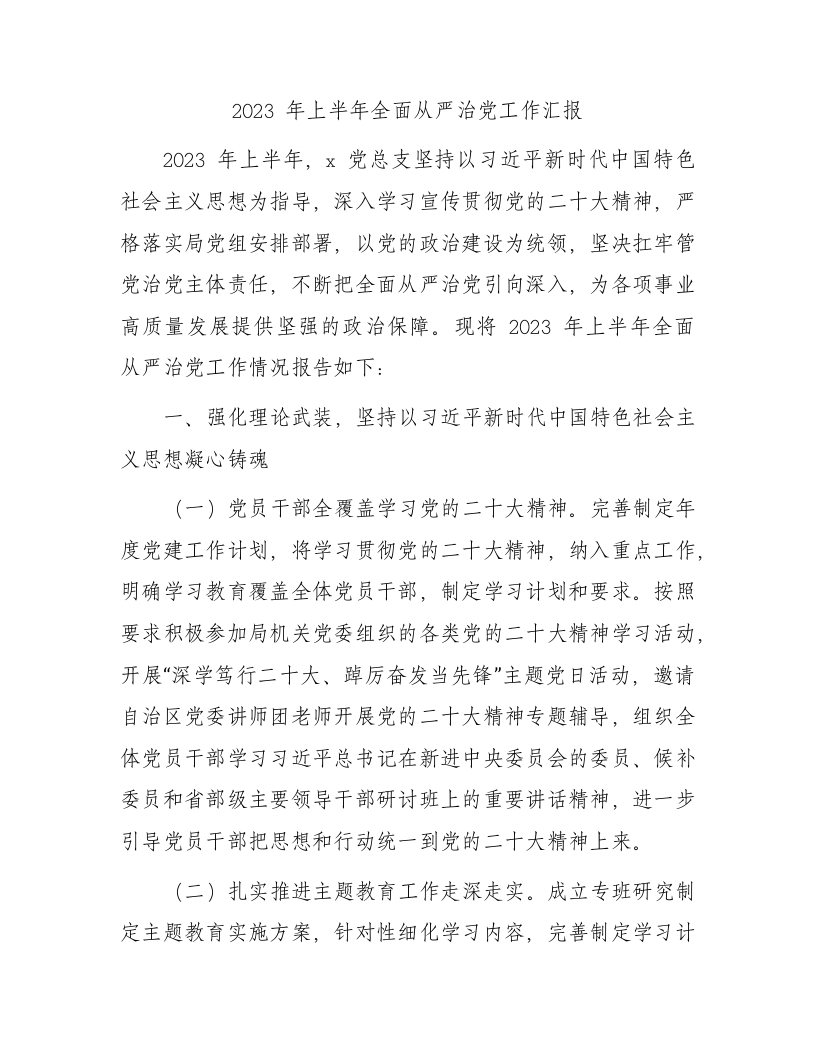 2023年上半年全面从严治党工作总结汇报报告