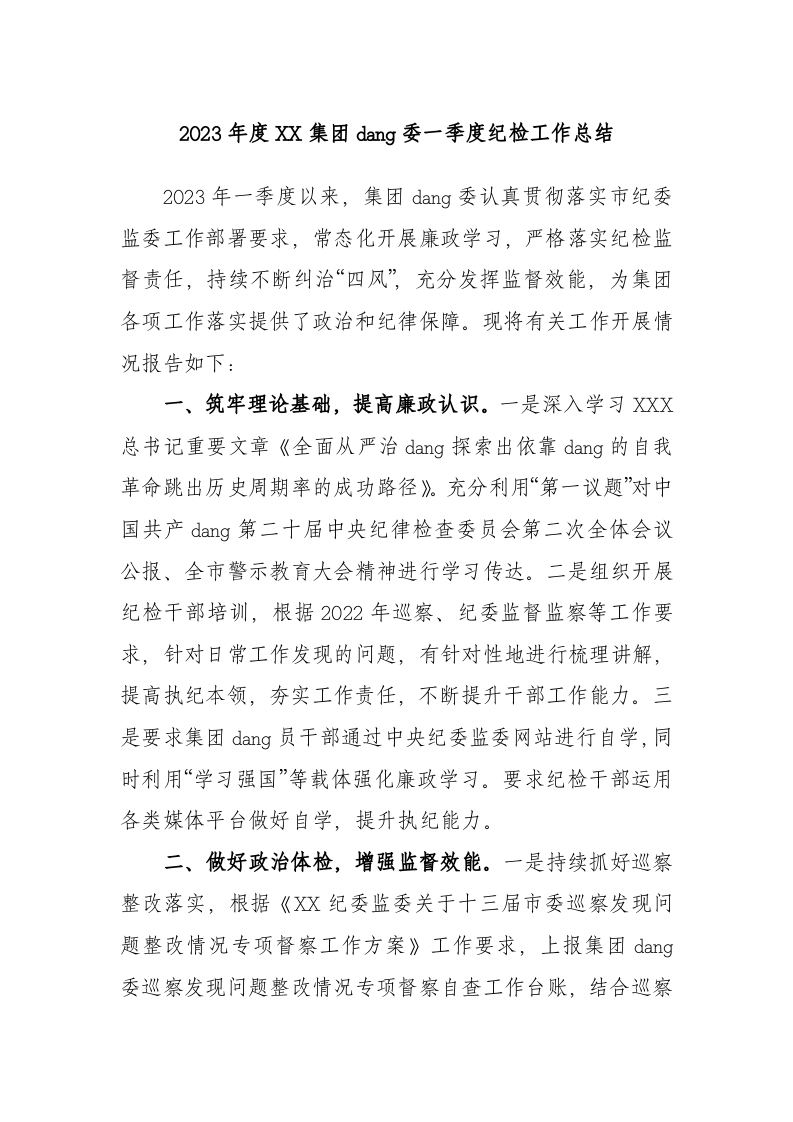 2023年度集团党委一季度纪检工作总结