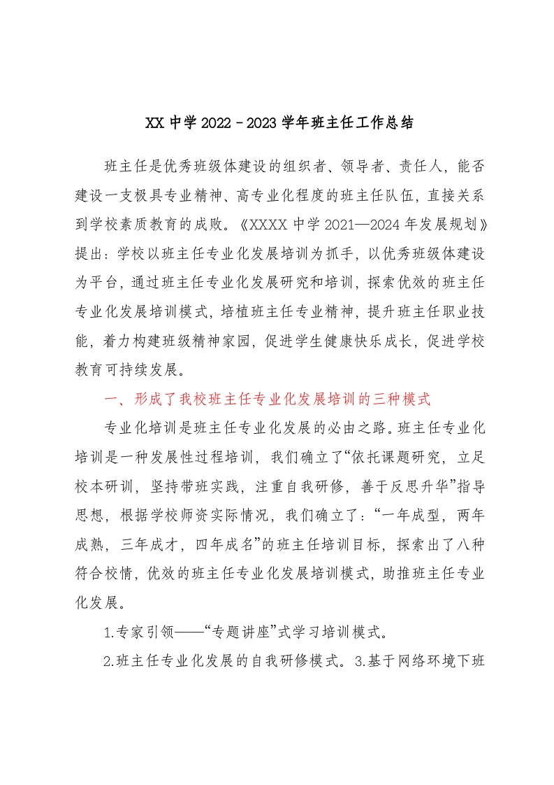 / XX中学2022-2023学年班主任工作总结