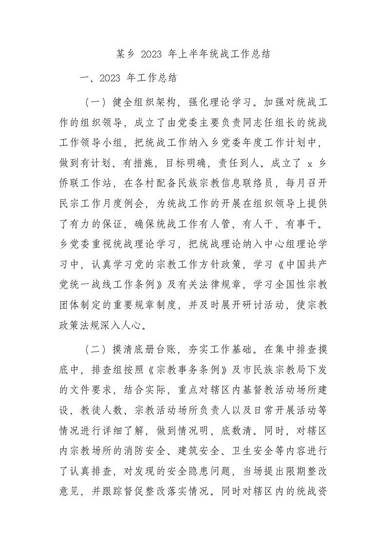 乡镇2023年上半年统战工作总结