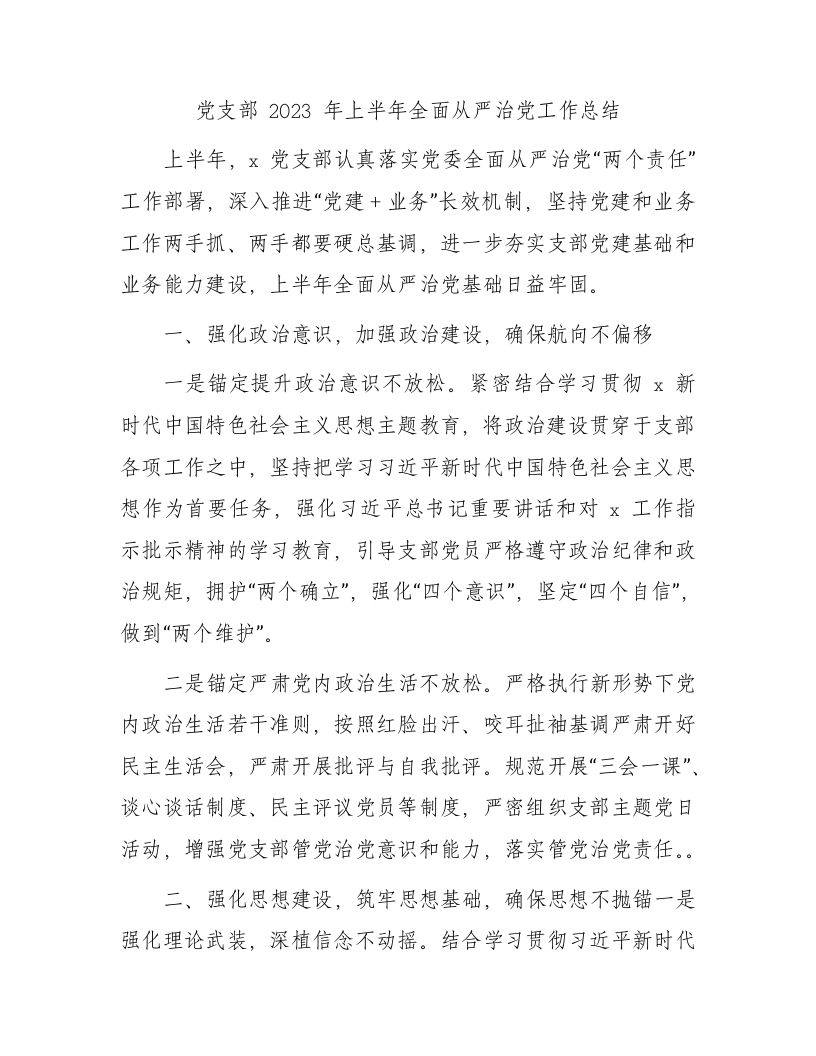 党支部2023年上半年落实全面从严治党工作总结2200字