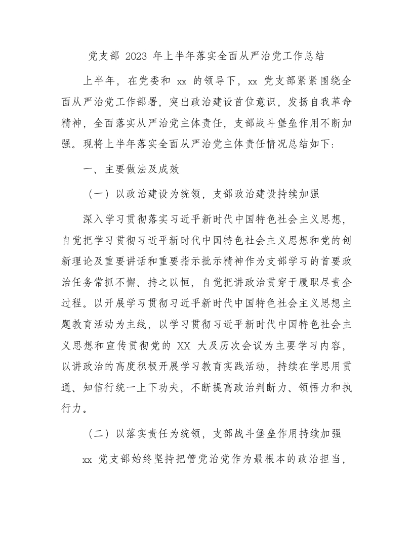 党支部2023年上半年落实全面从严治党工作总结2200字
