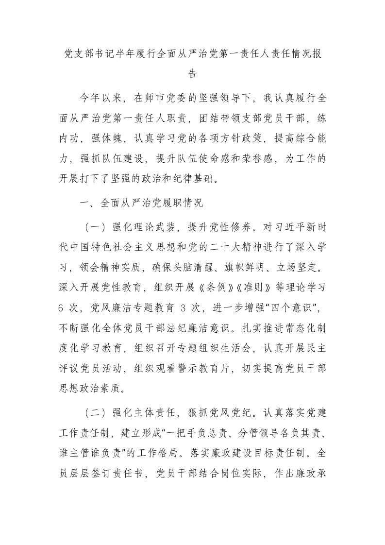 / 党支部书记半年履行全面从严治党第一责任人责任情况总结报告1800字