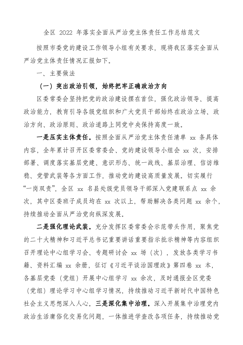 / 全区2022年落实全面从严治党主体责任工作总结范文