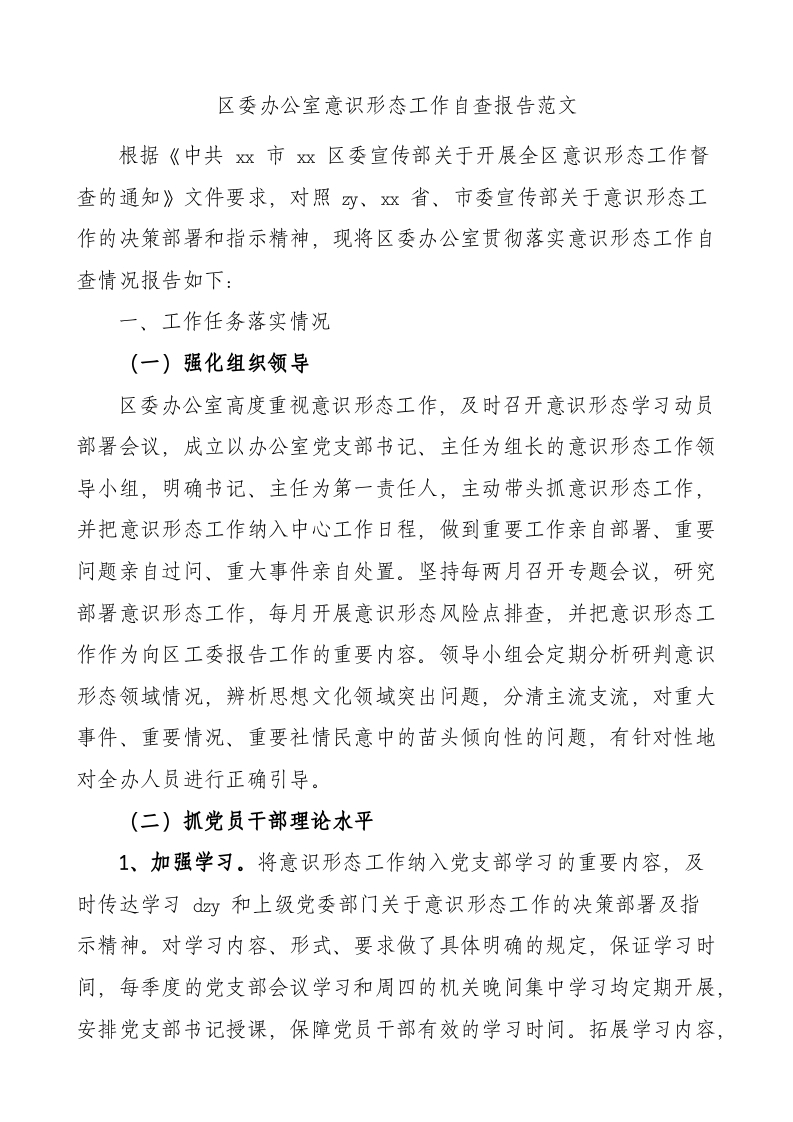 / 区委办公室意识形态工作自查报告(汇报总结)