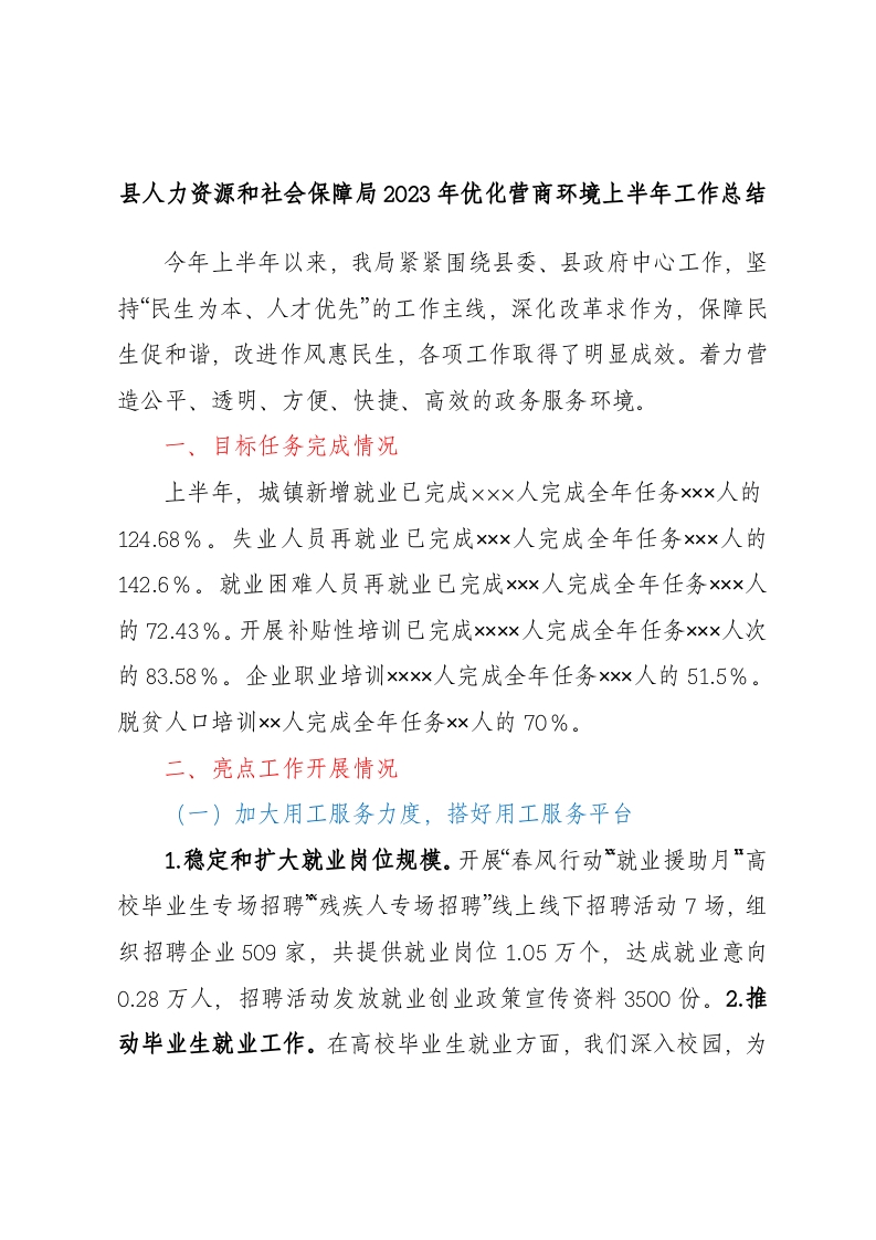 / 县人力资源和社会保障局 2023年优化营商环境上半年工作总结