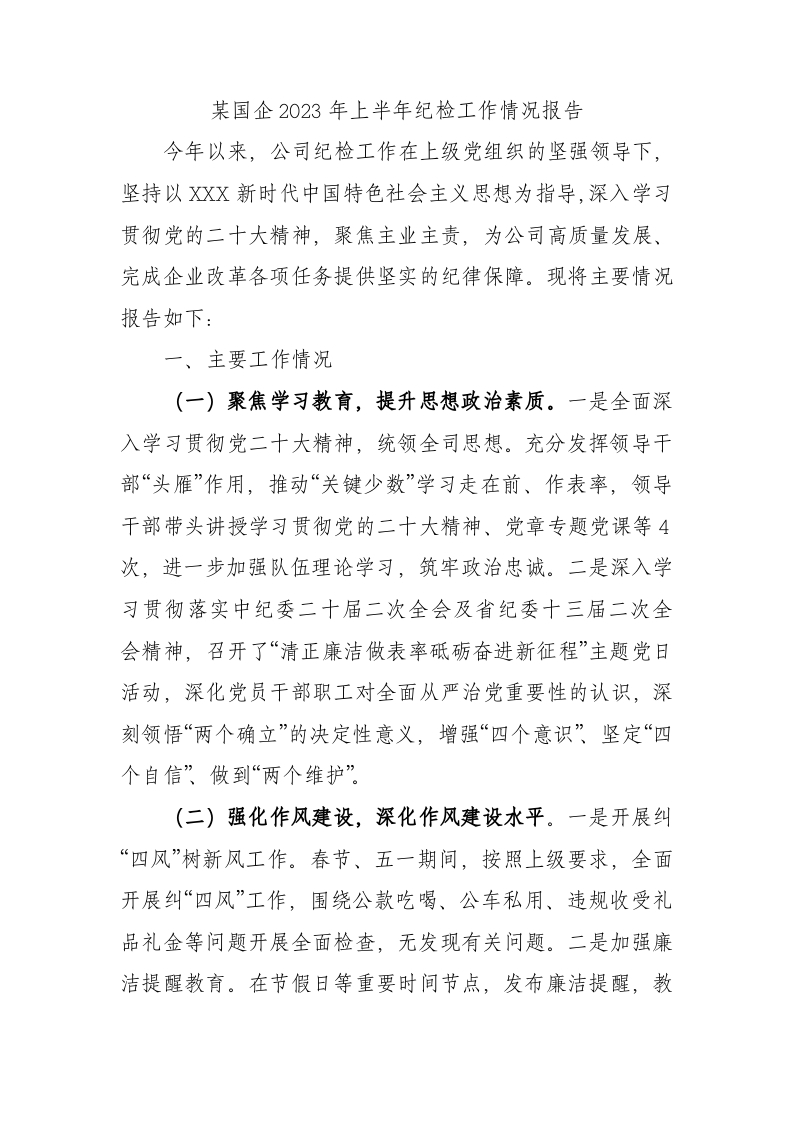 / 国企2023年上半年纪检工作总结