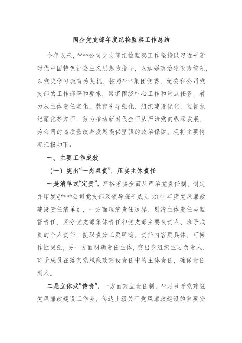 / 国企党支部年度纪检监察工作总结