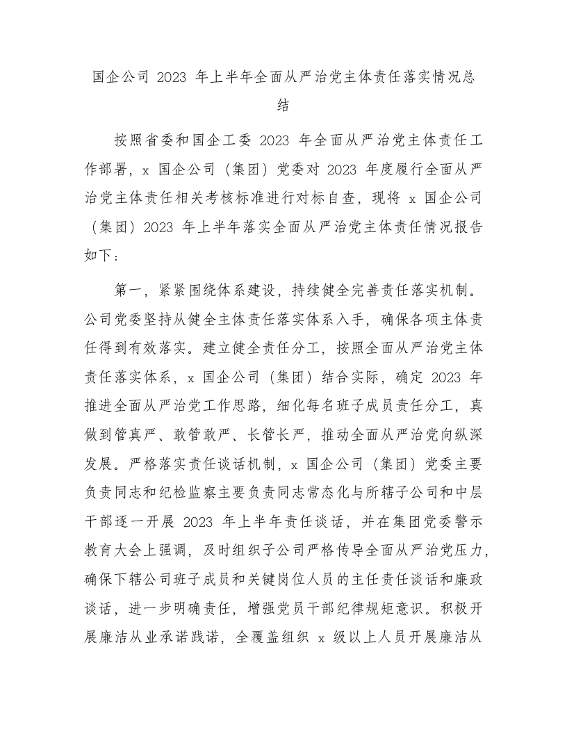 / 国企公司2023年上半年全面从严治党主体责任落实情况总结2200字