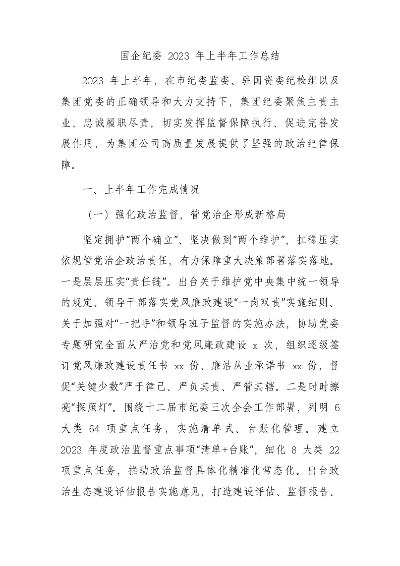/ 国企公司纪委2023年上半年工作总结3400字