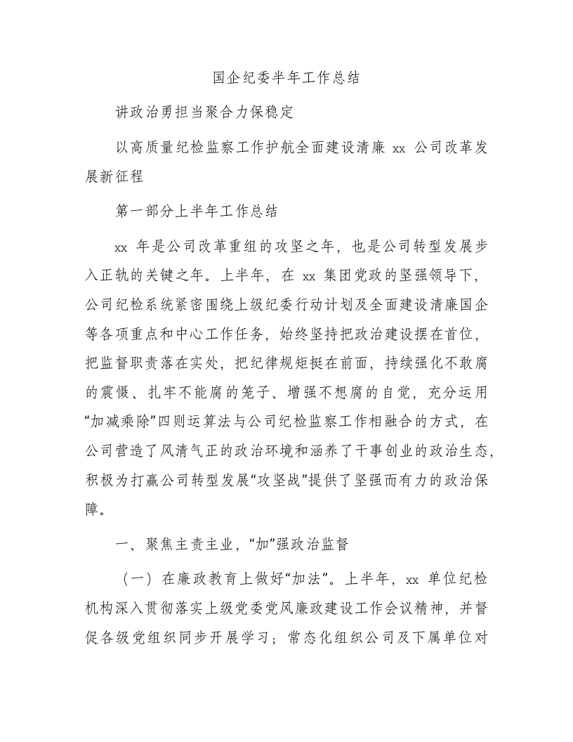 / 国企公司纪委(纪检监察)半年工作总结4900字