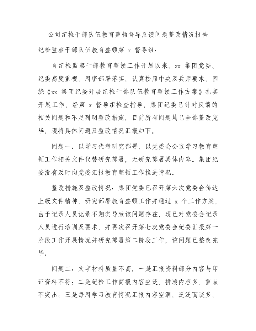 / 国企纪检干部队伍教育整顿督导反馈问题整改情况总结报告1500字