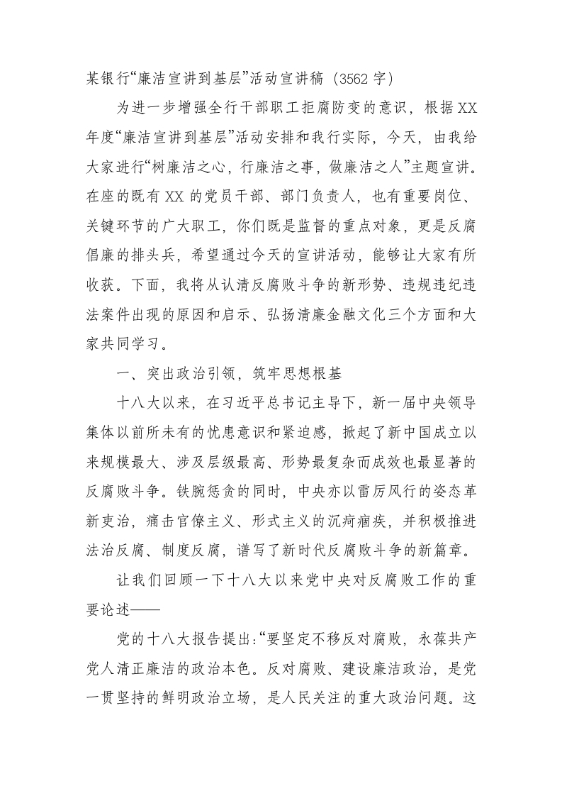 / 国企银行“廉洁宣讲到基层”活动宣讲稿
