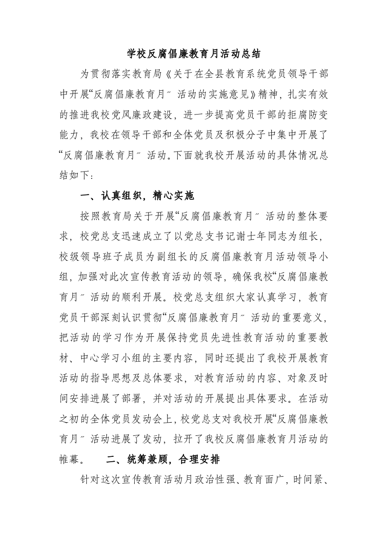 学校反腐倡廉教育月活动总结