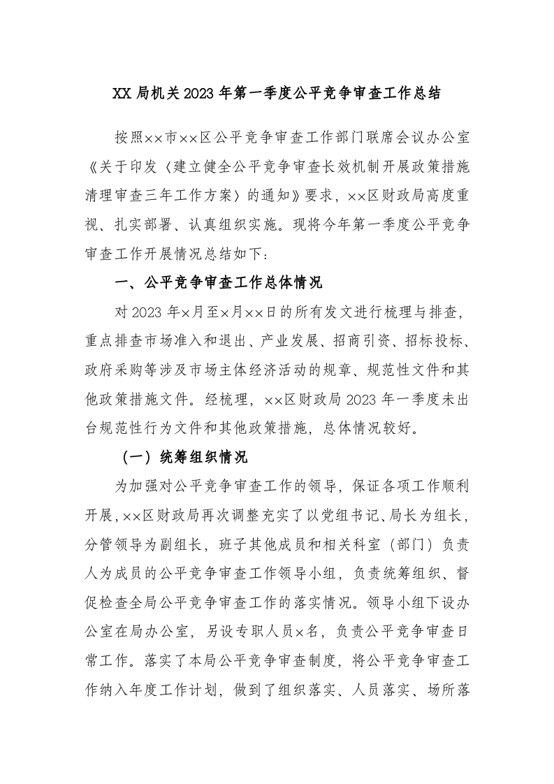 局机关2023年第一季度公平竞争审查工作总结