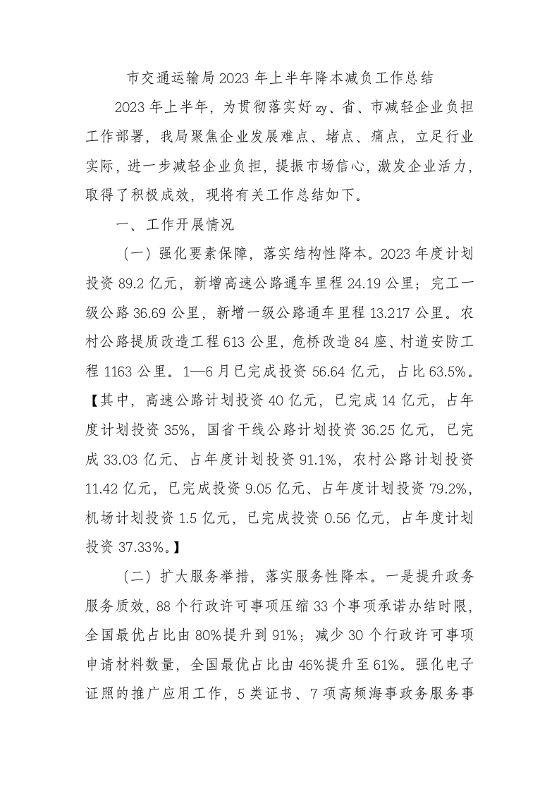 / 市交通运输局2023年上半年降本减负工作总结