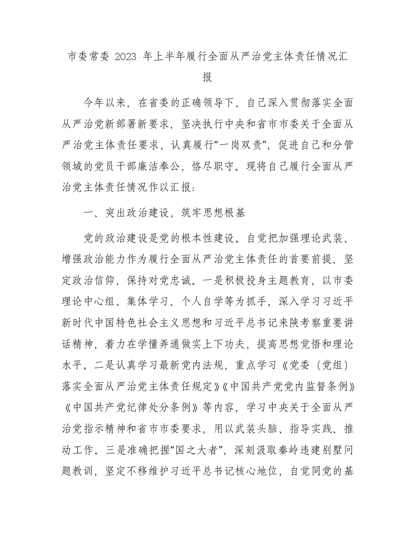 / 市委常委2023年上半年履行全面从严治党主体责任情况总结汇报2200字