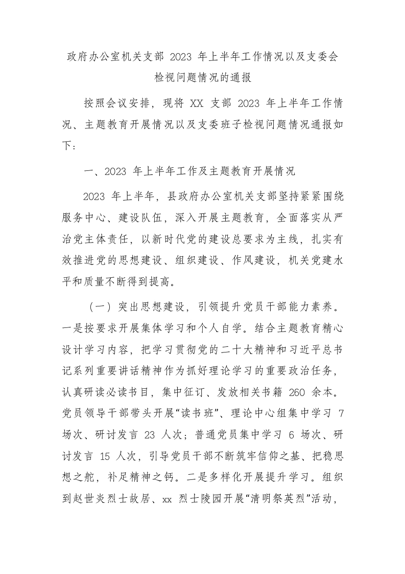 / 政府办机关党支部2023年上半年工作以及支委会检视问题情况总结报告