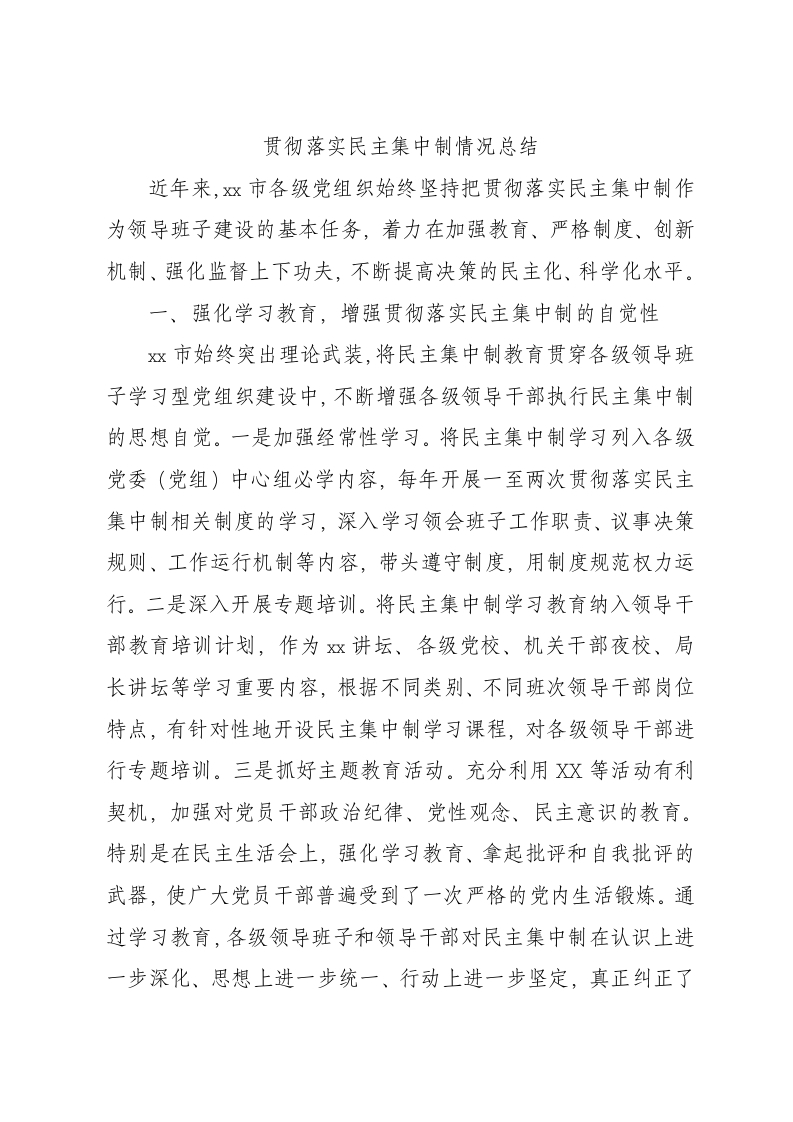 贯彻落实民主集中制情况总结2500字