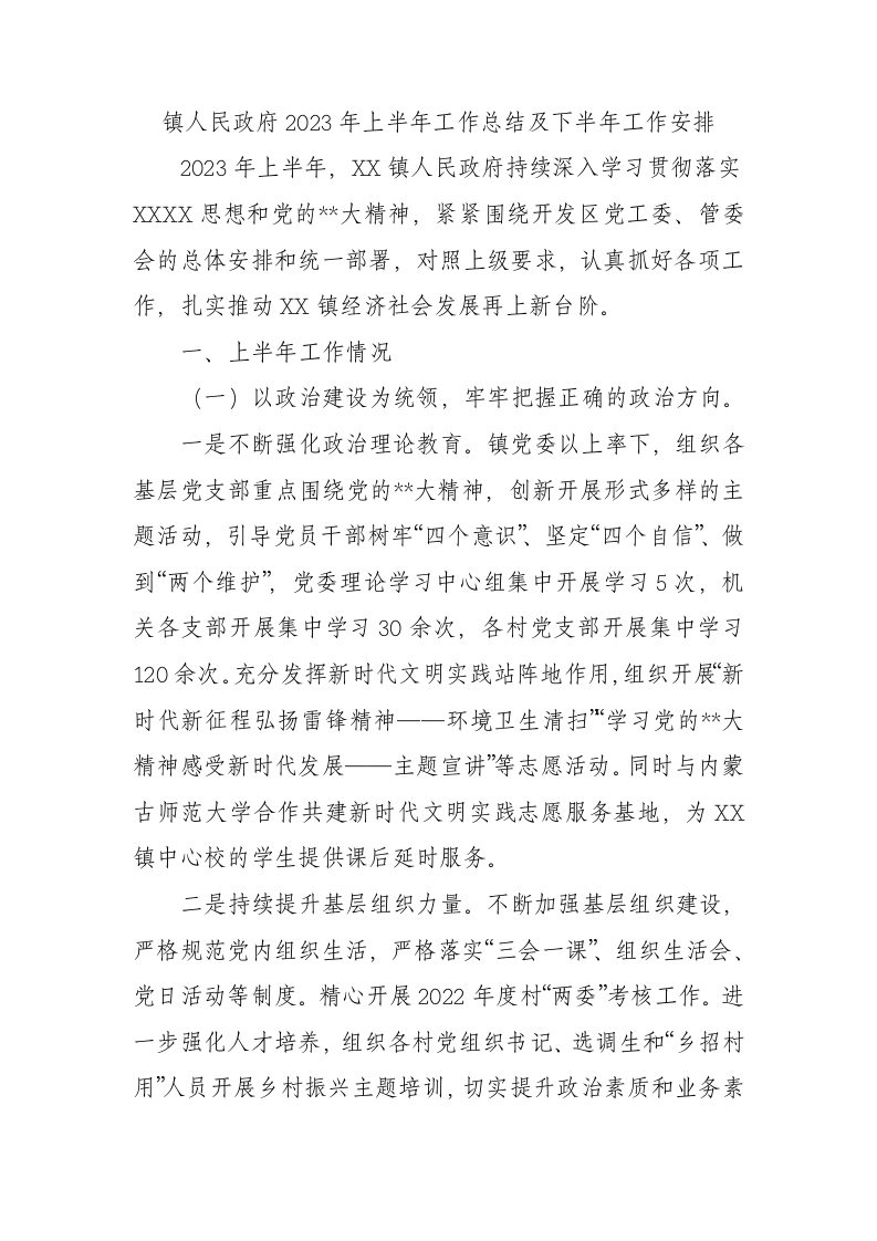 / 镇人民政府2023年上半年工作总结及下半年工作安排(计划)
