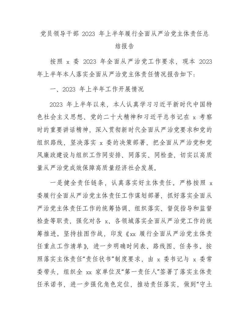 领导干部2023年上半年履行全面从严治党主体责任总结报告2600字
