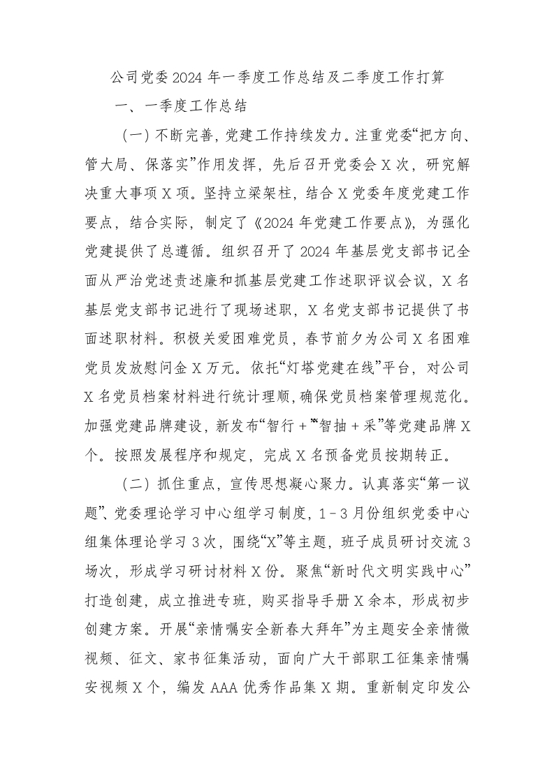 / 国企党委2024年一季度工作总结及二季度工作打算2800字