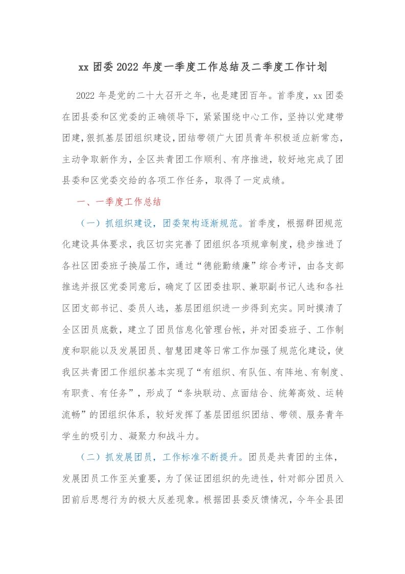 / xx团委2022年度一季度工作总结及二季度工作计划