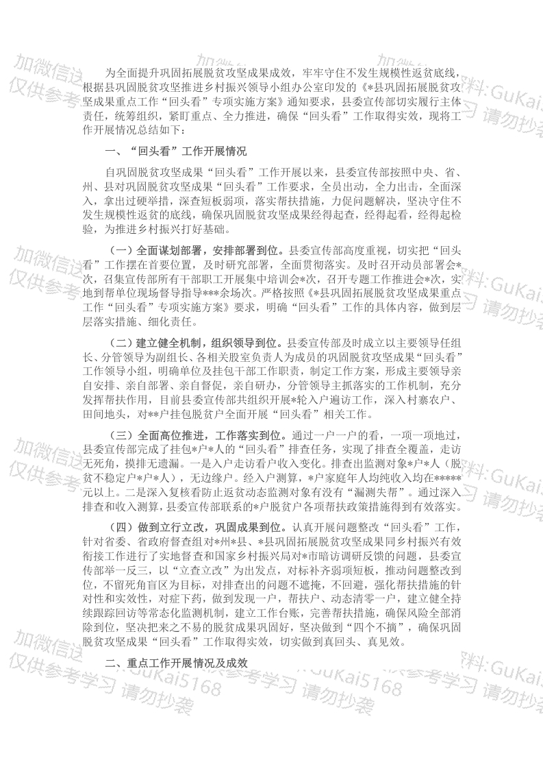 / 县委宣传部2022年巩固拓展脱贫攻坚成果重点工作“回头看”专项行动工作情况总结
