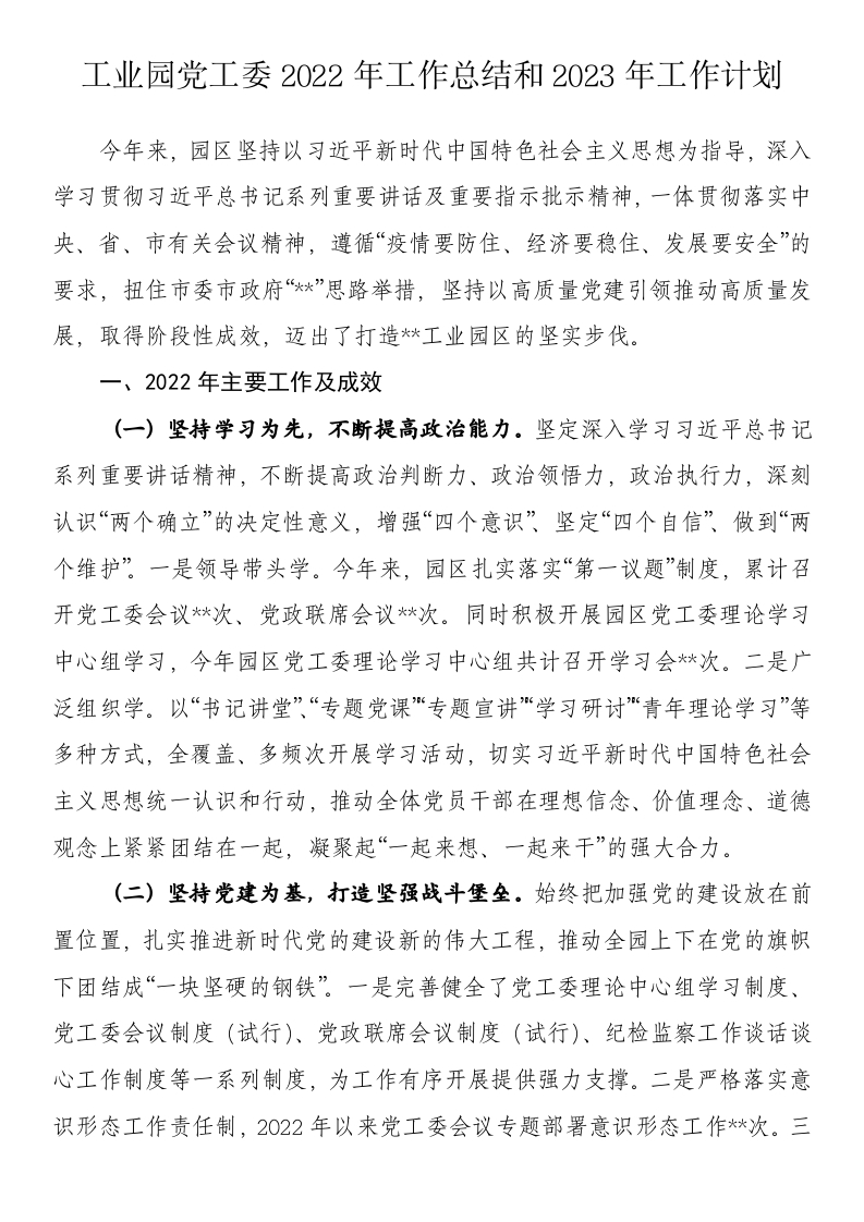 / 工业园党工委2022年工作总结和2023年工作计划