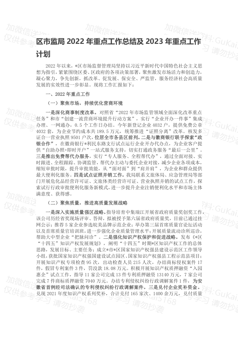 / 区市监局2022年重点工作总结及2023年重点工作计划