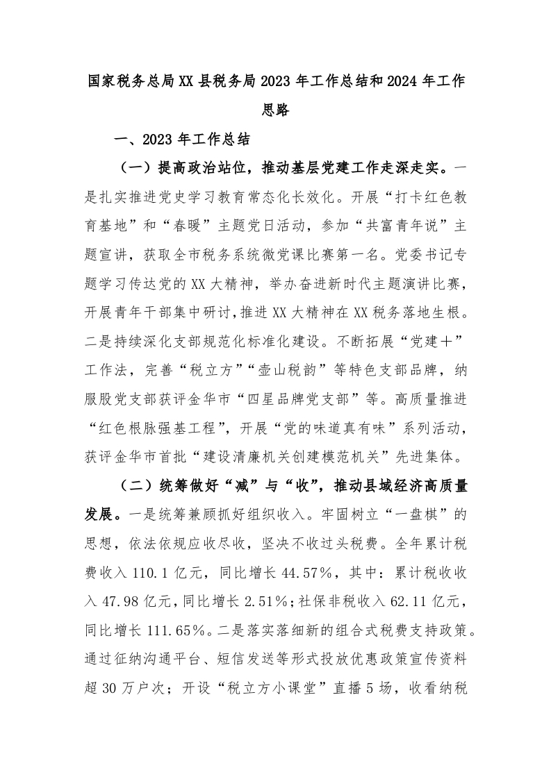 / 国家税务总局XX县税务局2023年工作总结和2024年工作思路