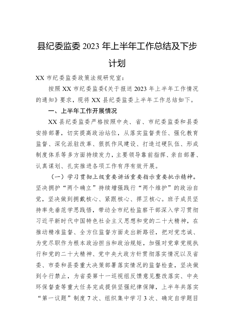 / 县纪委监委2023年上半年工作总结及下步计划