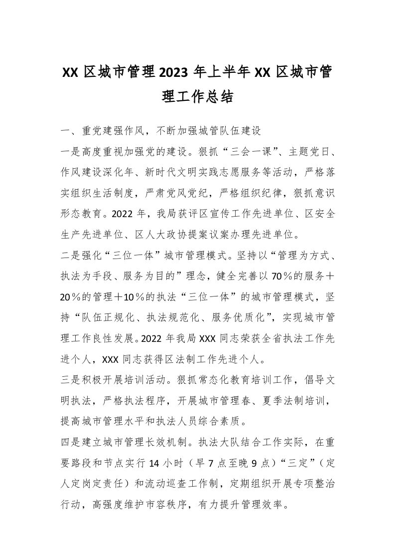 / XX区城市管理2023年上半年XX区城市管理工作总结