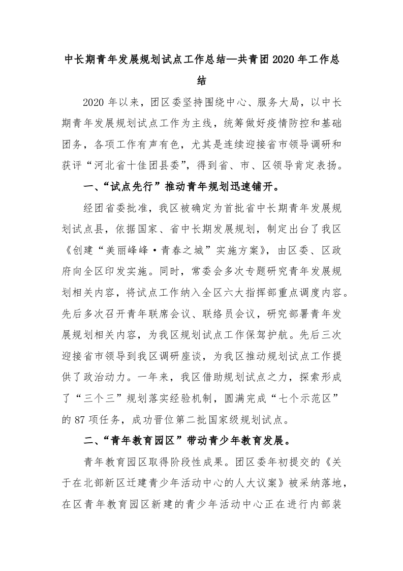 / 中长期青年发展规划试点工作总结—共青团2020年工作总结