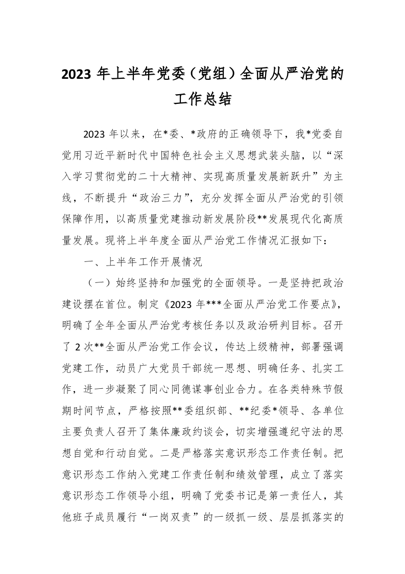 / 2023年上半年党委(党组)全面从严治党的工作总结