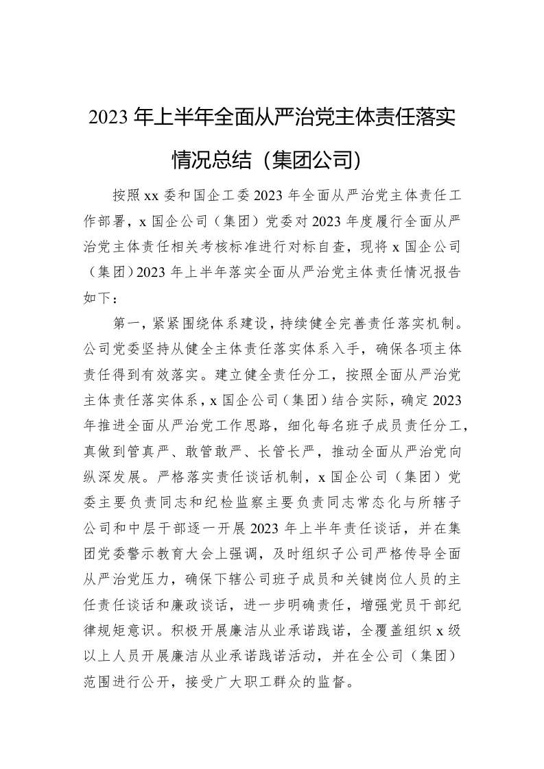 / 2023年上半年全面从严治党主体责任落实情况总结(集团公司)