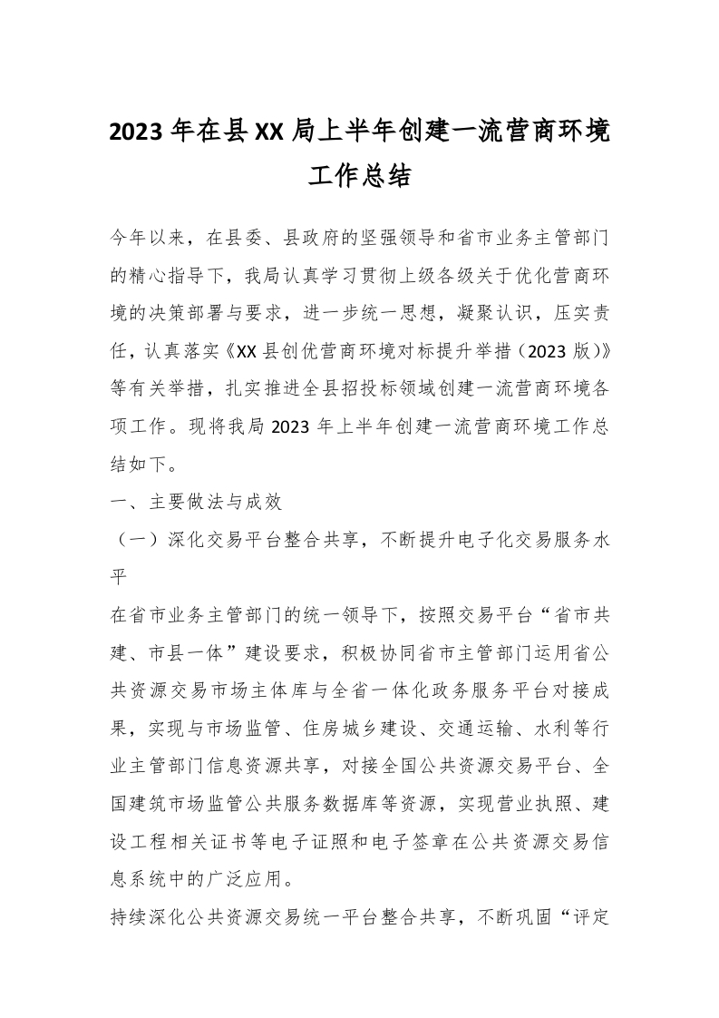 / 2023年在县XX局上半年创建一流营商环境工作总结