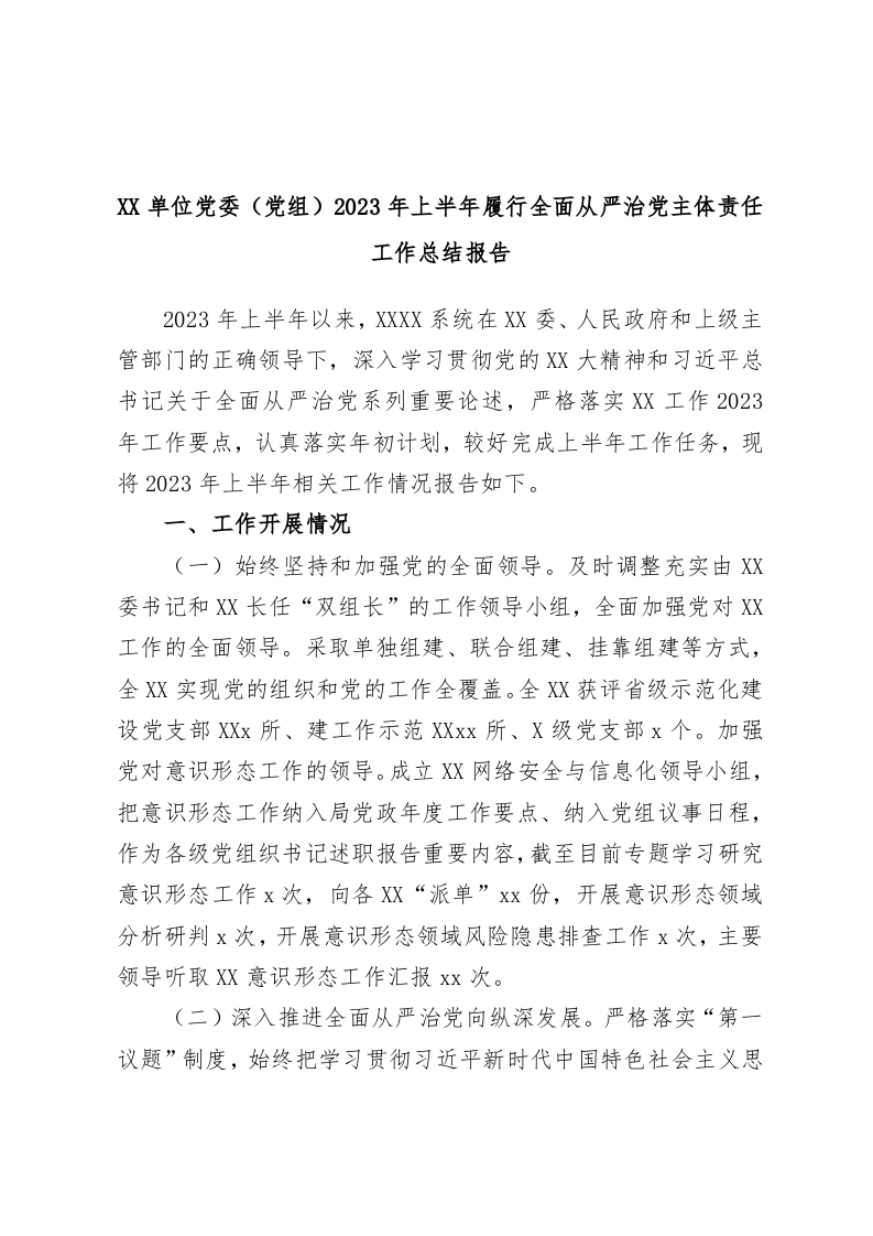 / XX单位党委(党组)2023年上半年履行全面从严治党主体责任工作总结报告