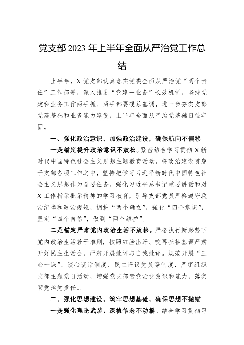 党支部2023年上半年全面从严治党工作总结